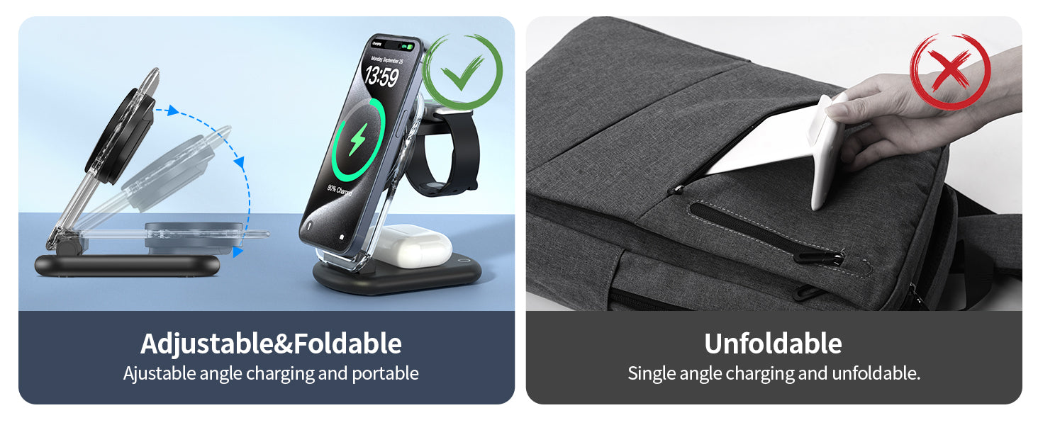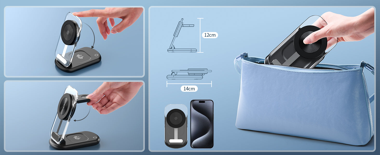 - Foldable & Travel Portable: The magsafe travel charger stand can be folded into a wireless charging pad smoothly and stored in your bag or carrying luggage, making it an ideal companion for your travels or business trips. The portable travel wireless mag safe charger for multiple devices suitable for office, library, home, travel and other occasions. Compact size, well built, fast charging, space saving, exactly what you need!