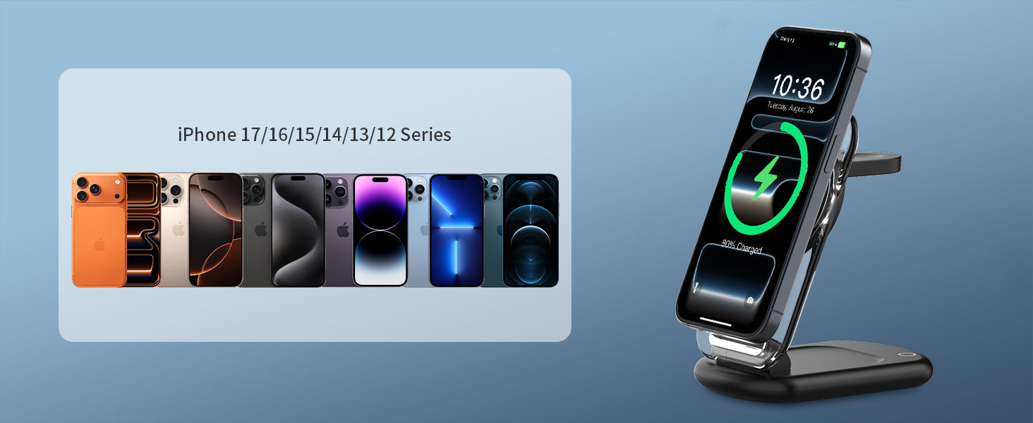 - 3 in 1 Magnetic Wireless Charger: The evolved mag safe charging station support charging iPhone,iwatch,AirPods simultaneously.Helping you end the messy cord life and tidy your desktop.The magnetic suction is suitable for iPhone 17/17 Air/17 Pro/17 Pro Max/16/15/15 Pro/15 Plus/15 Pro Max/14/14 Pro/14 Plus/14 Pro Max/13/13 Pro/13 Pro Max/12/12 Pro/12 Pro Max. It is also compatible with iWatch10/9/8/7/6/5/4/3/2/SE/Ultra/Ultra 2,for AirPods 2/3/4/Pro/Pro 2(Note:For AirPods 2/3/4 come in 2 versions,only work with wireless charging case, Doesn't support with A3058, A2897, A1602 charging case). (NOTE: Please take off your phone case when charging, or use a magnetic phone case.)